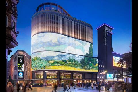 The screen, which would cover much of the building’s facade, would be used to support film premieres at the square’s three main cinemas and also display advertising and cultural content.